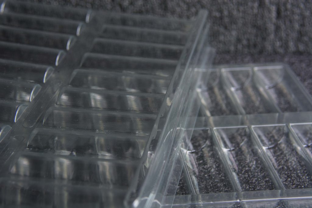 Trays mit konturgebundenen Deckeln sind Verpackungslösungen mit optimalem Transport- und Staubschutz. Durch die gleiche Ausformung der Ober- und Unterteile ist ein passgenauer Abschluss möglich. Die so verpackten Produkte sind weniger beweglich, besser vor Beschädigungen geschützt und können beim Transport nicht herausfallen. Ein zusätzlicher Vorteil des Abschlusses durch das Oberteil besteht darin, dass die Trays präzise aufeinandergestapelt werden können, ohne das Verpackungsgut zu berühren. Die Verpackungen können in Ein- und Mehrwegausführung sowie zusätzlich auch konturgebunden erstellt werden. Hausintern werden diese Arten von Verpackungen auch als P-Gruppen bezeichnet.